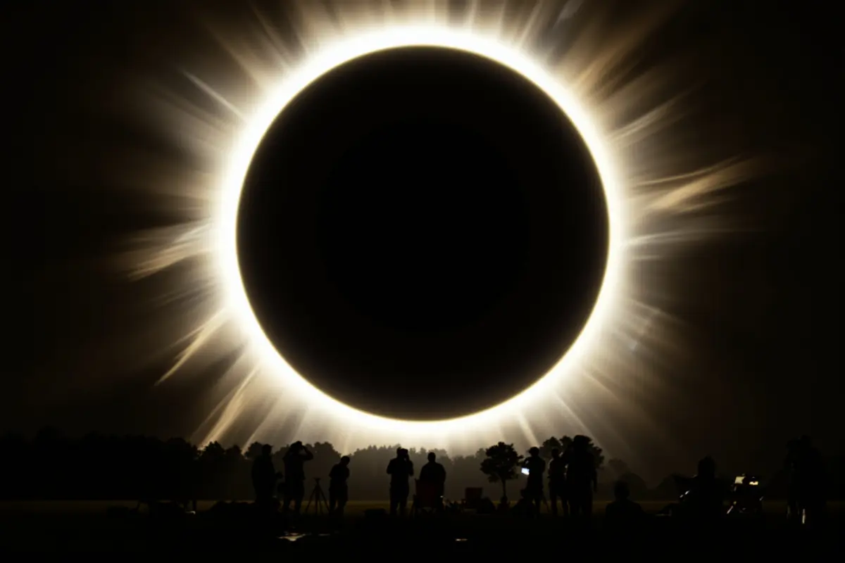As the Moon begins to slide in front of the Sun, it’s like watching a cosmic dimmer switch at work. Shadows sharpen. The air cools. A hush might fall over the crowd, or a collective gasp might rise as sunlight vanishes.